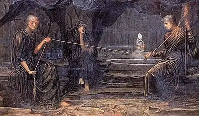 El mito habla de «el huso de la Necesidad». El cosmos está representado por el huso acompañado por sirenas y las tres hijas de la diosa Necesidad conocidas colectivamente como las Moiras. Su tarea es mantener el giro del huso. Las Moiras, las sirenas y el huso son utilizados en la República, en parte, para ayudar a explicar cómo los cuerpos celestes giraban alrededor de la Tierra de acuerdo con el entendimiento de Platón de la cosmología y la astronomía.