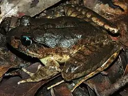 Esta rana puede alcanzar hasta 80 mm de longitud. Su superficie dorsal es marrón y más clara en los lados para fusionarse con el amarillo pálido de la superficie ventral. Un punto de forma irregular comienza entre los ojos y termina en el medio del dorso. Hay una banda oscura en la cabeza que comienza delante de la fosa nasal como un triángulo, que continúa desde la fosa nasal hasta el ojo, luego desde el ojo hasta el tímpano y termina en el hombro. El tímpano es ligeramente ovalado y distinto. El iris es azul claro, con reflejos dorados sobre la pupila y marrón oscuro debajo. Las cuatro o seis barras en las extremidades posteriores son pálidas y no muy contrastantes. Los dedos de los pies son tres cuartos y los dedos son libres.