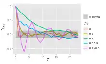 Por un proceso AR(1) con un resultado positivo , sólo el término anterior en el proceso y el término de ruido contribuyen a la salida. Si está cerca de 0, entonces el proceso todavía se ve como ruido blanco, pero como se aproxima a 1, la salida se pone una mayor contribución de la anterior legislatura en relación con el ruido. Esto resulta en una "suavizado" o integración de la salida, similar a un filtro de paso bajo.
