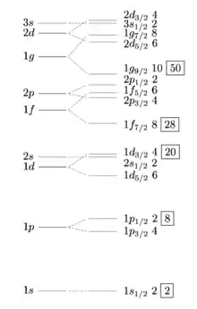 Esto significa que se espera que los números mágicos sean aquellos en los que todas las capas disponibles estén llenas. De acuerdo con los resultados experimentales, se tienen las cifras 2 (nivel 0 completo) y 8 (niveles 0 y 1 completos) para los dos primeros números. Sin embargo, el conjunto completo de números mágicos no se genera correctamente de acuerdo con el razonamiento aplicable a los electrones, y se deben calcular de la siguiente manera: