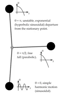 dado que para . Esto es un oscilador armónico simple correspondiente a las oscilaciones del péndulo cerca del punto inferior de su trayectoria. Otra linealización posible es en torno al punto , correspondiente al péndulo en sentido vertical: