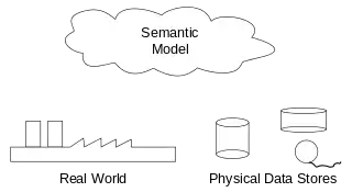 La estructura de datos lógicos de un sistema de administración de la base de datos (SGBD), ya sea jerárquico,de red o relacional, puede no satisfacer totalmente los requisitos para una definición conceptual de datos, porque tiene alcance limitado y sesgado hacia la estrategia de implementación empleada por el SGBD. Por lo tanto, la necesidad de definir datos desde una visión conceptual ha llevado al desarrollo de técnicas de modelado de datos semánticos. Es decir, técnicas para definir el significado de los datos dentro del contexto de sus interrelaciones con otros datos. Como se ilustra en la figura. El mundo real, en términos de recursos, ideas, eventos, etc., se define simbólicamente en los almacenes de datos físicos. Un modelo de datos semánticos es una abstracción que define cómo los símbolos almacenados se relacionan con el mundo real. Así, el modelo debe ser una verdadera representación del mundo real.[1]