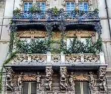 La etapa milanesa del estilo liberty se inauguró con la construcción del Palazzo Castiglioni, que terminó en 1903 según el proyecto de Giuseppe Sommaruga, quien se convertiría, según Sacerdoti, en el más destacado intérprete del modernismo milanés.[9] El edificio, decorado con esculturas de cemento de tema floral y composiciones de hierro forjado típicas del nuevo estilo, se distancia del art nouveau por sus formas monumentales y el uso de elementos clásicos como los putti, tomados de los cercanos palacios nobiliarios, en los que domina el estilo neoclásico.[17] El palacio, considerado por López, Susani y Roiter uno de los mejores ejemplos del modernismo italiano y construido en una de las calles más elegantes de Milán, remarcaba aún más claramente el estatus de la nueva clase burguesa e introdujo con fuerza en la ciudad el uso del cemento como elemento escultórico.[18][19] La «señal de ruptura» lanzada a la vieja clase dirigente fue todavía más intensa debido a la presencia a ambos lados de la entrada de dos estatuas que representaban a dos mujeres desnudas en poses muy atrevidas, que provocaron un gran escándalo, hasta el punto de que el palacio fue rebautizado coloquialmente por los milaneses la ca' di ciapp (la «casa de las nalgas») en referencia al desnudo posterior de las dos mujeres y el arquitecto fue obligado a retirarlas y trasladarlas a la entonces periférica Villa Faccanoni, otro ejemplo de villa suburbana liberty, proyectada también por Sommaruga, en la que se reprodujeron las esculturas de putti y el motivo de las ventanas divididas por columnas de la última planta del Palazzo Castiglioni.[20]