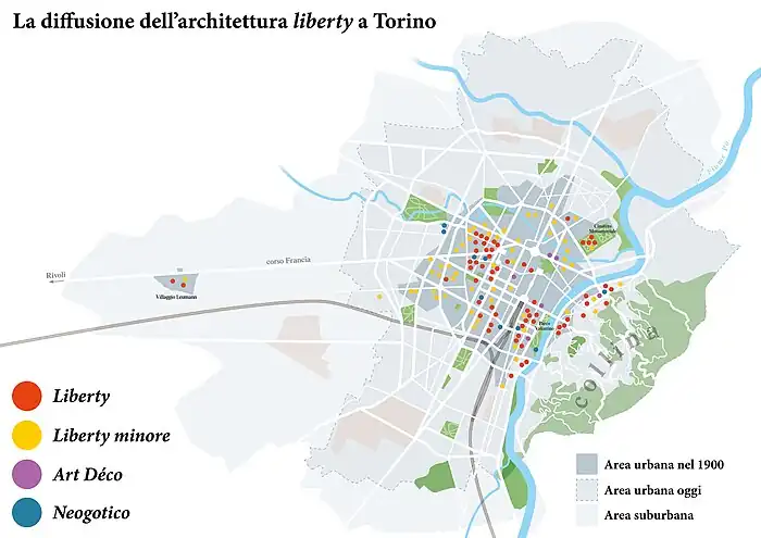 Debido al éxito de esta corriente estilística y la tipología de edificios que se construyeron en las primeras décadas del siglo XX, Turín fue definida como una de las «capitales italianas del modernismo»,[2] tanto que todavía en la actualidad se pueden observar abundantes testimonios arquitectónicos de esa época.[3]