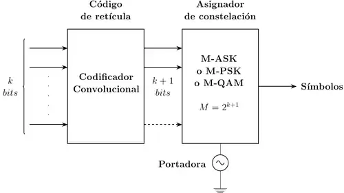 Un modulador para TCM consiste en dos bloques con funciones definidas: un codificador convolucional con una tasa de y un asignador de constelación, que es en realidad un modulador digital implementado en uno de los tres posibles tipos de modulación digital de niveles el cual asigna la modulación adecuada a la cantidad de bits que se obtengan.