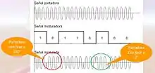 PSK (Phase-shift keying), es una modulación de fase donde la señal moduladora (datos) es digital, la fase de la señal portadora se desplaza para representar con ello a los datos digitales.