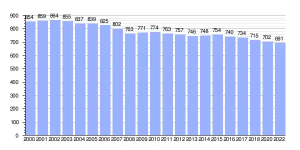 | Gráfica de evolución demográfica de Mogor[2] entre 2000 y 2022 |