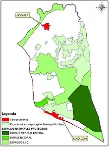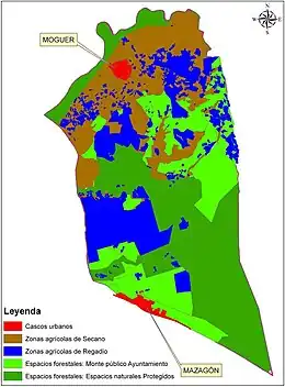 El término municipal de Moguer está compuesto por los cascos urbanos de Moguer y Mazagón, y los pequeños núcleos urbanos de Las madres y el Poblado Forestal; las zonas agrícolas con cultivos de secano y regadío; y los espacios forestales integrados por el monte público del ayuntamiento y los espacios naturales protegidos (parque nacional y natural de Doñana entre otros).