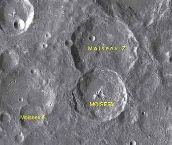 Antes de ser nombrado en 1970 por la UAI,[1] Moiseev era conocido como "Cráter 198", y Moiseev Z era conocido como "Cráter 197".[2]