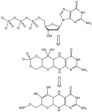 La biosíntesis de la molibdopterina comienza con la guanosina trifosfato. Dos reacciones enzimáticas convierten a este trifosfato en el fosfato cíclico de la piranopterina. Una de estas enzimas hace uso de un mecanismo de radical SAM, a menudo asociado con reacciones de formación de enlaces de tipo C-X. Esta piranopterina intermediaria, luego es convertida a molibdopterina por la acción de tres enzimas adicionales. En esta conversión, se forma el eneditiolato, aunque los sustituyentes unidos a los azufres permanecen siendo desconocidos. El azufre es transportado desde cisteinil persulfuro, en una forma que recuerda a la biosíntesis de las proteínas hierro-azufre. A continuación el monofosfato es adenilado (unido a ADP) en un paso que causa la activación del cofactor para permitirle unir Mo o Tu. Estos metales son transportados desde sus respectivos oxianiones molibdato y tungstato. Finalmente, el Mo o W se inserta en el anillo para producir el cofactor de molibdeno. En algunas enzimas, tales como la xantino oxidasa, el metal se encuentra unido a una molécula de molibdopterina, mientras que en otras enzimas, por ejemplo en la DMSO reductasa, el metal se encuentra unido a dos cofactores molibdopterina.[3]