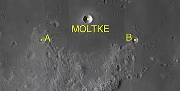 Por convención estos elementos son identificados en los mapas lunares poniendo la letra en el lado del punto medio del cráter que está más cerca Moltke.