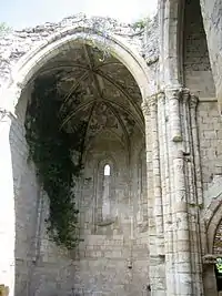- Cubiertas. Las naves se cubren con bóvedas de crucería de nervios muy marcados; únicamente el lado meridional del crucero se cubre de bóveda de cañón apuntada. Los arcos, apuntados, se apoyan en semicolumnas con capiteles de decoración vegetal. Las bóvedas y sus correspondientes nervaturas se apoyan en el muro a través de una cornisa soportada mediante pilastras y semicolumnas adosadas, con capiteles de decoración vegetal y en los gruesos pilares octogonales entre las naves. Solo se conservan las cubiertas de los tres ábsides y la nave sur.