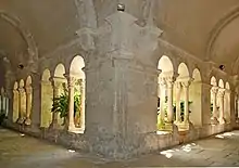 El claustro es prácticamente cuadrado. El recinto es muy acogedor con su jardín, y cuenta con dos galerías en torno de los años 1140-1150 (galerías norte y este) y dos galerías más recientes construidas en el siglo XII. Los arcos están agrupados en grupos de tres grandes arcos sustentados en los pilares fuertes y están separados por columnas pareadas realizadas con hermosos capiteles. Estos tienen una rica decoración que se conserva en relativo buen estado. Hay decoración vegetal y también algunos capiteles con figuras.