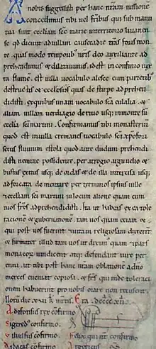 Documento del año 874, del rey Alfonso III, en el que le otorga, entre otros sitios, la Tierra de Alión y el Monasterio de San Martin, a Sisnando, monje de Santo Toribio de Liébana