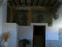 Se conservan restos de pintura mural en las cuatro esquinas del claustro, donde se representa a San Blas, Santa Águeda, Jesús en el Pretorio, Santa Clara con San Francisco, y el apóstol Santiago. Algunas de las pinturas se muestran cortadas en su parte inferior, como consecuencia de las sucesivas reformas que ha sufrido el claustro, y en alguna de las esquinas han desaparecido prácticamente. En el interior del claustro también se localiza un cristo crucificado gótico arcaizante, probablemente del siglo XIV, en un retablo fechable hacia 1540 y formado por dos columnas abalaustradas, enmarcando una tabla con la representación de la Virgen y San Juan. También puede contemplarse un lienzo dedicado al Cristo de la Penitencia, que muestra un Jesucristo hombre, encogido física y moralmente en sus últimas horas, siendo una obra de curiosa iconografía aunque no de gran calidad artística.[1]