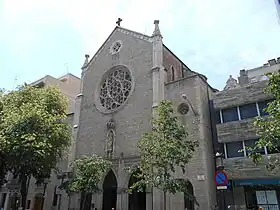 La primitiva iglesia gótica, construida entre los siglos XIV y XV, fue reconstruida en el emplazamiento actual de la Rambla de Cataluña sin fidelidad al modelo original, de modo que resulta difícil discernir los elementos del templo original de las recreaciones historicistas de Joan Martorell. Se le atribuyen los contrafuertes, la espadaña, el pórtico y, en general, toda la fachada actual, de estilo neogótico.[2]