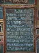 Por la Voluntaddel Padre y la Ayuda del Hijo y la realización del Espíritu Santo y por los grandes llanuras tomadas por el fiel Kir Grigorie, Metropolitano de todo el país de Moldavia, se añadió este pequeño porche y se pintó el exterior de toda la iglesia, por el bien de su alma, en 7055 (1547).