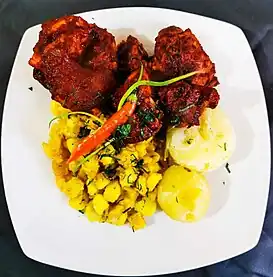 Actualmente el plato está basado en carne de cerdo en ají colorado, se sirve acompañado por mote de maíz coloreado con achiote, y papas peladas,[4] lo que le da al platillo un color característico rojo y amarillo.