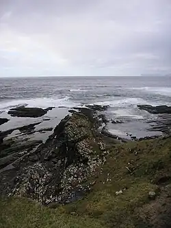 A los pies y a la derecha del arco natural «Den's Door» (al norte de Broad Haven en la bahía de St Bride, Reino Unido) aparece «Sleek Stone«, una estructura rocosa inclinada de origen sedimentario, aparentemente monoclinal