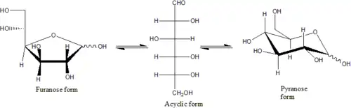 En estas formas cíclicas, el anillo suele tener cinco o seis átomos. Estas formas se denominan furanosas y piranosas, respectivamente, por analogía con el furano y el pirano, los compuestos más simples con el mismo anillo carbono-oxígeno (aunque carecen de los dobles enlaces de estas dos moléculas). Por ejemplo, la glucosa aldohexosa puede formar un enlace hemiacetal entre el grupo aldehído en el carbono 1 y el hidroxilo en el carbono 4, dando lugar a una molécula con un anillo de 5 miembros, llamada glucofuranosa. La misma reacción puede tener lugar entre los carbonos 1 y 5 para formar una molécula con un anillo de 6 miembros, llamada glucopiranosa. Las formas cíclicas con un anillo de siete átomos (el mismo del oxepano), que rara vez se encuentran, se denominan heptosas.