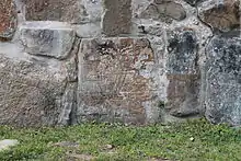 En la base del Edificio J se muestra una piedra grabada, misma que se denomina "Lápida de conquista". Existen diversas de estas lápidas, en ellas se muestran escenas de conquistas realizadas por Monte Albán sobre otros pueblos entre el 100 a. C. y el 200 d. C.. En cada piedra es posible apreciar el glifo de Monte Albán y debajo una cabeza invertida que supone representar a los vencidos. Se cree que la existencia de dichas lápidas sirvió para mostrar la fuerza y el poder de los ejércitos ante los ojos de los locales.