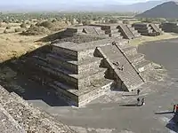 La arquitectura monumental de Monte Albán recibió la influencia de los primeros centros urbanos de los Valles Centrales de Oaxaca, como San José Mogote y Dainzú. Especialmente San José Mogote poseía una plaza central en torno a la cual se organizaban las plataformas sobre las que se construyeron los edificios públicos de ese centro protourbano. Pero, de acuerdo con la reconstrucción realizada por Marcus y Flannery (1996), las plataformas de Mogote estaban constituidas por un solo cuerpo. En contraste, algunas de las construcciones rescatadas en la zona arqueológica de Monte Albán constan de dos o más cuerpos superpuestos. Este rasgo arquitectónico es resultado de la influencia de Teotihuacán sobre la capital zapoteca. En Monte Albán, la técnica de construcción de talud-tablero[26] fue adaptada por los zapotecos, dando lugar al estilo clásico de esta ciudad, con taludes amplificados, rematados por pequeños tableros de doble escapulario.[27]
