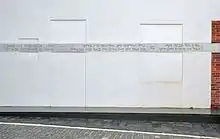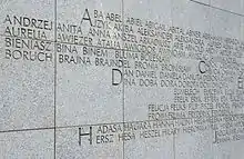 Cada nombre también conmemora simbólicamente a mil víctimas del gueto de Varsovia. En la parte central del muro hay cuatro placas de piedra con inscripciones en polaco, yídish, inglés y hebreo: