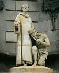 | Fray Bernardo Boyl | Manuel Fuxá | Piedra caliza | 3,20 x 1,81 x 1,50 | Bernardo Boyl fue un ermitaño de Montserrat, diplomático y vicario apostólico de las Indias Occidentales. Acompañó a Colón en su segundo viaje a América. Está representado de pie, vestido con sotana y con la tonsura capilar de los monjes. Junto a él se arrodilla un indio americano, que le besa la mano. Esta figura fue restaurada en 1965 por Josep Miret.[18] | ![]() |