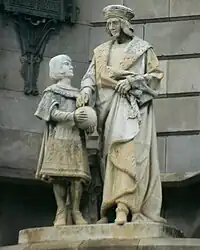 | Jaume Ferrer de Blanes | Francesc Pagès | Piedra caliza | 3,10 x 1,85 x 1,23 | Jaume Ferrer de Blanes fue diplomático, cosmógrafo y escritor, y elaboró un nuevo mapa del mundo después del descubrimiento de América. Aparece de pie vestido con los ropajes de la época, con unos pergaminos en la mano izquierda, mientras que con la derecha señala un globo terráqueo que sostiene un paje a su lado. Esta escultura fue restaurada en 1965 por Josep Miret.[19] | ![]() |