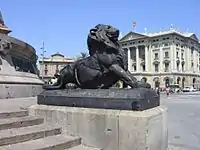 | Leones | Agapit Vallmitjana i Abarca (boceto), Josep Carcassó (modelo), Alejandro Wohlguemuth (ingeniero) | Hierro pintado de negro | 2,61 x 1,41 x 3,22 (tipo 1), 2,80 x 1,06 x 3,02 (tipo 2) | En la base del monumento se emplazan ocho figuras de leones dispuestos de forma perimetral. Están en actitud de alerta, custodiando el monumento. Los dos que miran hacia al mar y los dos que miran hacia la montaña están sentados, mientras que los otros están de pie. El tratamiento de las figuras es naturalista, no en vano Vallmitjana estaba especializado en esculpir animales.[23] | ![]() |