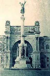 Al momento de exponerse la maqueta del monumento en París, es sabido que la Victoria Alada era una de las figuras que ya se encontraban listas en el momento, de manera que formó parte de dicha exposición. Sin embargo, también se sabe que fue el diplomático Pedro Gálvez Egúsquiza quien solicitó una leve reducción del tamaño de la Victoria, y es probable que recogiese la recomendación del jurado de solicitar una simplificación de algunos detalles, incluyéndose algunas en la Victoria.