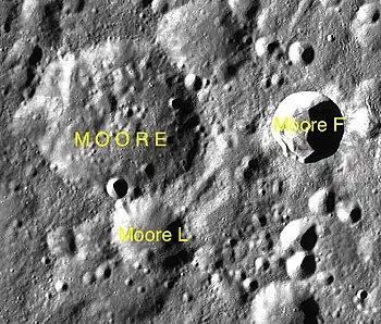 Moore es un cráter de impacto perteneciente a la cara oculta de la Luna. Al igual que gran parte de la cara oculta, Moore se encuentra en una región que ha sido saturada por los impactos. Cerca de este elemento se localizan Larmor al sur-suroeste, y Parsons a la misma distancia hacia el oeste.