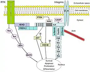 Las señales provistas por la matriz son recibidas por receptores transmembranales llamados integrinas. Las integrinas son capaces de reonocer la fibronectina o laminina extracelular. En los dominios citoplasmáticos de la proteína, encontramos sitios de unión con comoponentes de citoesqueleto como la actina. Estas uniones permiten a la células migrar sobre la matriz o cambiar su forma.[4]