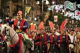![]() Escuadra Oficial de la Filà Manta Roja en el desfile de la Entrada | ||