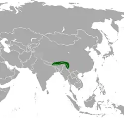 En China, habita el noreste de Yunnan y sudeste del Tíbet, el norte de Birmania, noreste de India, Bután y oriente de Nepal.[1] Se ha reportado en alturas de 2600-4200 m s. n. m. Habita en bosque de moderada inclinación en ocasiones cerca del límite superior de los árboles.