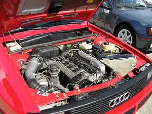 El motor Audi de cinco cilindros en línea se utilizó ampliamente en los deportes del motor, particularmente en el Grupo B de rallies con el famoso Audi S1 Sport Quattro E2 de 600 hp, y en el Campeonato IMSA GT con el Audi 90 Quattro IMSA GTO 2.1 20V de 720 hp.[19][20][21][22]