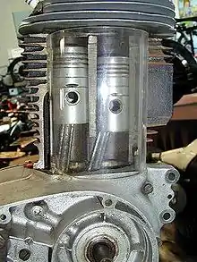 El sistema del motor de pistón doble envía la mezcla de combustible y aire desde la tronera de admisión impulsada hacia arriba por un pistón hacia la cámara de combustión, barriendo el gas de escape por el otro orificio hacia afuera por una tronera opuesta a la de admisión.[1]