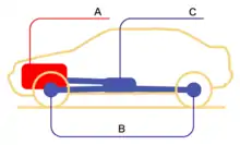 - Delantero central: el centro de masas del motor se coloca entre el eje de las ruedas delanteras y el habitáculo, obteniéndose características dinámicas más similares a las de un motor central.
