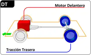 En el campo del diseño automovilístico, una configuración con motor delantero y tracción trasera (DT) es aquella en la que el motor está ubicado en la parte delantera del vehículo y las ruedas motrices están ubicadas en la parte trasera.[1] Fue el diseño tradicional durante la mayor parte del siglo XX.[2] También se utiliza en autobuses de piso alto y autobuses escolares.