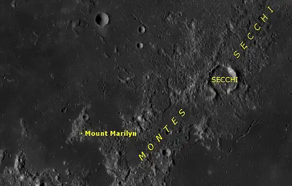 El Mount Marilyn es una montaña lunar perteneciente a los Montes Secchi, que separan el Mare Fœcunditatis (al este) del Mare Tranquillitatis (al oeste).