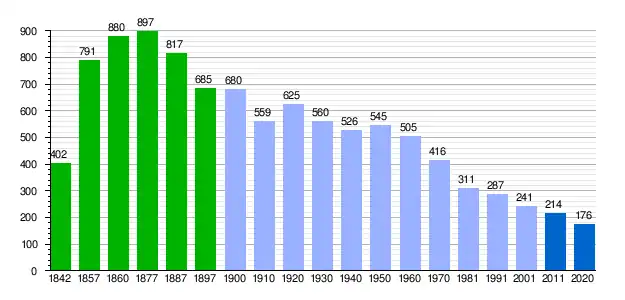 Población de derecho (1842-1897, excepto 1857 y 1860 que es población de hecho) según los censos de población del siglo XIX.[14] Población de derecho (1900-1991) o población residente (2001) según los censos de población del INE.[14] Población según el padrón municipal de 2011[15] y de 2020 del INE. |