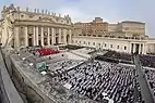 El cardenal Joseph Ratzinger, entonces prefecto de la Congregación para la Doctrina de la Fe, fue elegido papa Benedicto XVI el 19 de abril de 2005, sucediendo a Juan Pablo II. Renunció como papa a las 20:00 (CET) del 28 de febrero de 2013, siendo la primera renuncia papal en casi seis siglos desde el papa Gregorio XII en 1415,[7] y la primera en renunciar voluntariamente desde el papa Celestino V en 1294.[8][9] Citó específicamente el deterioro de su salud como el motivo de su renuncia.[10]