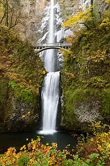 Multnomah Falls es una cascada situada en la garganta del río Columbia en Oregón, en los Estados Unidos. Compuesta por dos etapas, con una altura total de 189 metros, es la catarata más alta de todo el estado y también la más popular, atrayendo a casi 2 millones de visitantes por año.[1]