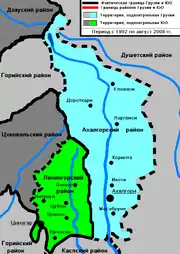 Como resultado de la Guerra de Osetia del Sur de 1991-1992, el municipio de Ajalgori estuvo dividido entre los dos países durante 16 años. El oeste de la región (comprendiendo el territorio del desfiladero de Lehur y la llanura de Tiripon), poblado casi exclusivamente por osetios, permaneció bajo el control de la autoproclamada República de Osetia del Sur. Para la parte controlada por las autoridades osetias, se dejó el nombre soviético de distrito de Leningor, y su centro administrativo estaba en el pueblo de Tsinagari. En el territorio más grande y más poblado, correspondiente con la parte oriental de la región (la garganta de Ksani Gorge), se quedó bajo el poder de la República de Georgia. Aquí la población era mixta, pero predominaban los georgianos. El nombre histórico Ajalgori se devolvió al municipio y a la ciudad,y en 1995, la región de Akhalgori se incluyó en la región de Mtsjeta-Mtianeti. Tanto el lado osetio como el georgiano siempre han considerado toda el distrito/municipio dentro de las fronteras anteriores al conflicto como parte de su territorio.
