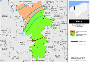 En el municipio de Mérida se registran dos tipos de clima, la zona norte y noroeste registra clima clasificado como Semiseco muy cálido y cálido, el resto del territorio tiene un clima Cálido subhúmedo con lluvias en verano;[12] la temperatura promedio anual del tercio sur del territorio del municipio es superior a los 26 °C, mientras que el resto, centro y norte, registra una temperatura promedio inferior a esta cifra;[13] la precipitación promedio anual en la mayor parte del municipio de Mérida, en su zona centro y sur, es de 1.000 a 1.100 mm, después de esta zona sentido sureste a noroeste, se suceden una serie de bandas que promedios inferiores de precipitación, siendo estos de 800 a 1.000 mm la primera, de 700 a 800 mm la segunda, de 600 a 700 mm el tercero, y de 500 a 600 mm la cuarta y última que ocupa el extremo noroeste del municipio.[14]