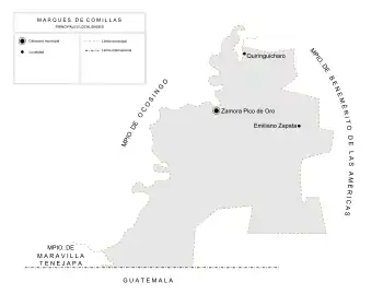 El municipio de Marqués de Comillas es uno de los 122 municipios del estado mexicano de Chiapas, ubicado en lo profundo de la Selva Lacandona, colinda con el departamento guatemalteco de Quiché. Es de reciente creación, siendo erigido el 28 de julio de 1999.