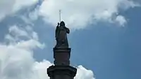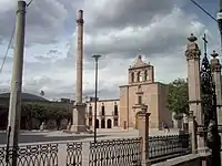 Columna de 21.50 metros colocada en el centro del atrio, entre el templo de la Purísima y el de San Miguel Arcángel.