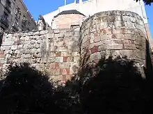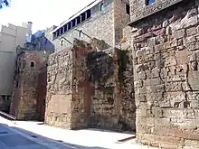 El recinto de Barcino estaba amurallado, con un perímetro de 1,5 km, que protegía un espacio de 10,4 ha.[11] La primera muralla de la ciudad, de fábrica sencilla, se comenzó a construir en el siglo I a. C. Tenía pocas torres, solo en los ángulos y en las puertas del perímetro amurallado, de las que había cuatro: la Praetoria (plaza Nueva), la Decumana (calle Regomir), la Principalis Sinistra (plaza del Ángel) y la Principalis Dextra (calle del Call).[12] Sin embargo, las primeras incursiones de francos y alamanes a partir de los años 250 suscitaron la necesidad de reforzar las murallas, que fueron ampliadas en el siglo IV. La nueva muralla se construyó sobre las bases de la primera, y estaba formada por un muro doble de 2 metros, con espacio en medio relleno de piedra y mortero. El muro constaba de 81 torres de unos 18 m de altura, la mayoría de base rectangular (diez con base semicircular, situadas en las portaladas).[13]