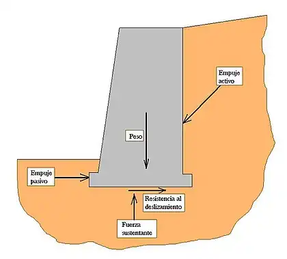 - Verificación de deslizamiento: Se verifica que la componente horizontal del empuje de la tierra (Fh) no supere la fuerza de retención (Fr) debida a la fricción entre la cimentación y el suelo, proporcional al peso del muro. En algunos casos, puede incrementarse (Fr) con el empuje pasivo del suelo en la parte baja del muro. Normalmente[1] se acepta como seguro un muro si se da la relación: Fr/Fh > 1.3 (esta relación se puede llamar también coeficiente de seguridad al deslizamiento).