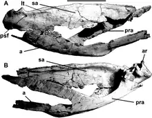 Además, está presente una combinación única de rasgos que en sí mismos no son únicos. En la caja del encéfalo, el proceso basipterygoide está situado en la parte frontal inferior de la base del esfenoide, mientras que la entrada de la depresión profunda del receso base del esfenoide se dirige oblicuamente hacia arriba y hacia atrás. El esfenoide base muestra una muesca ancha y poco profunda entre la tubera basilaria y el proceso basipterygoide. Los huesos del galón son bastante rectos.[2]